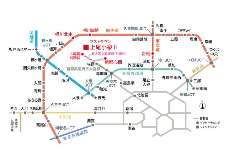 圏央道「桶川加納IC(車で13分/約6080m〜約6100m)」や「桶川北本IC(車で12分/約5830m〜約5850m」が近く、東北道や関越道へのアクセスがスムーズです。
