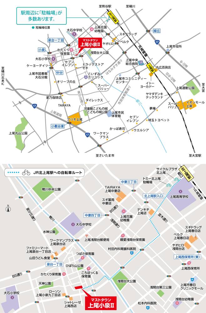 「北上尾」駅へ自転車で10分(約1650~1670m)。「上尾道路」や「国道17号線」の幹線道路で、車での移動もスムーズです。