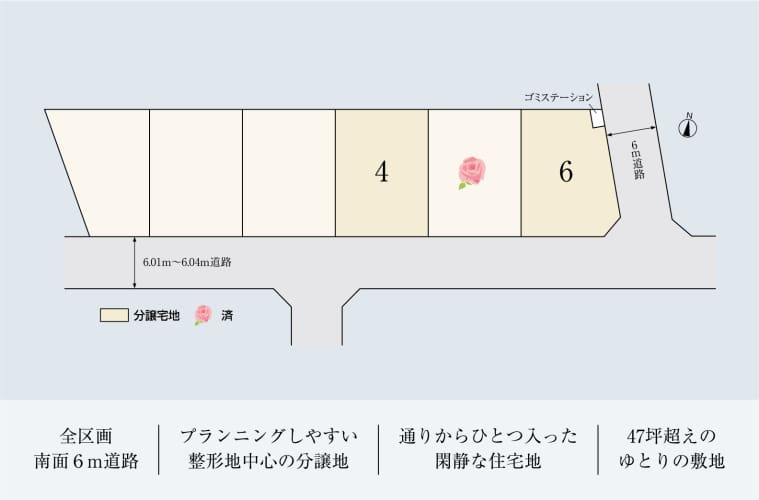 整然とした区画整理地内の分譲地。全区画南面6m道路でプランニングしやすい敷地形状です。