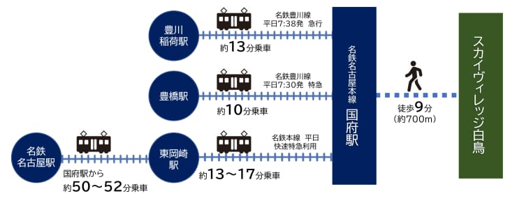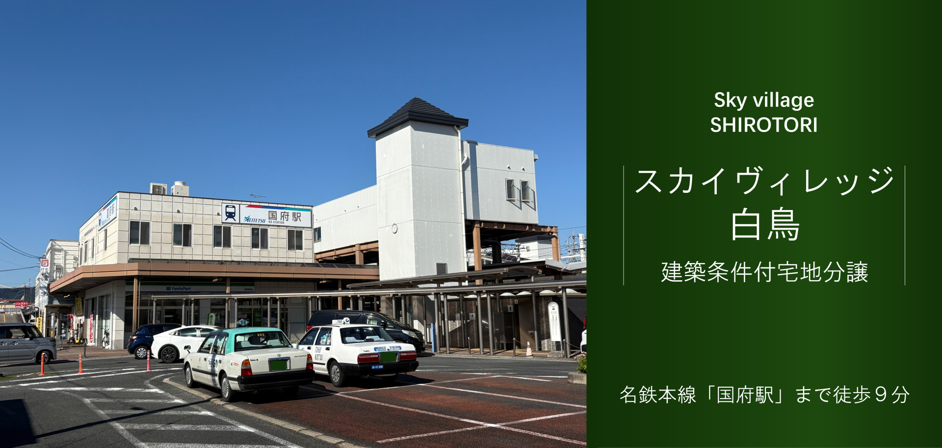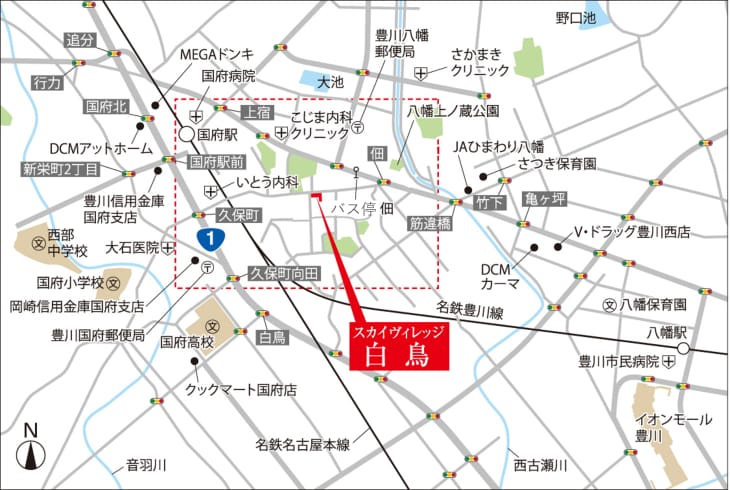 名古屋方面へも豊橋方面へもアクセス便利な特急停車駅の名鉄名古屋本線国府駅まで徒歩9分。全て50坪以上の全5区画分譲地
