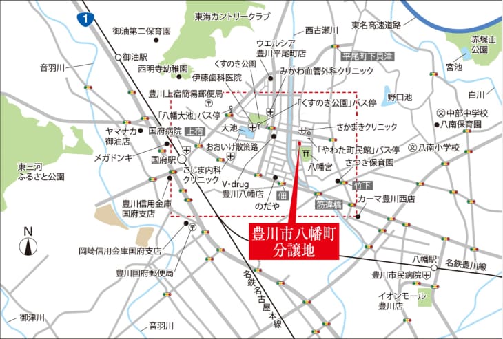 現地から1350m~1420m。 徒歩17分~18分。名鉄本線国府駅