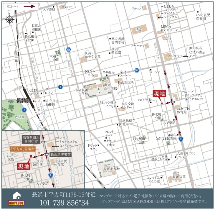 徒歩1分の「平方東」停留所から、JR北陸本線「長浜」駅までバス22分。