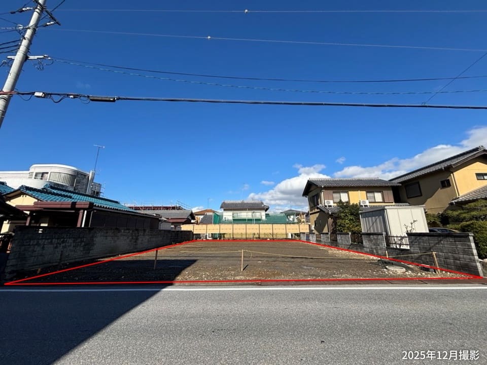 南東道路に面した、90坪超の整形地。前面道路の幅員は約6.4mあり、車の入出庫を円滑に行えます。国道8号(長浜バイパス)へ出やすく、日常的に車を利用される方にも嬉しい環境です。/2025年12月撮影