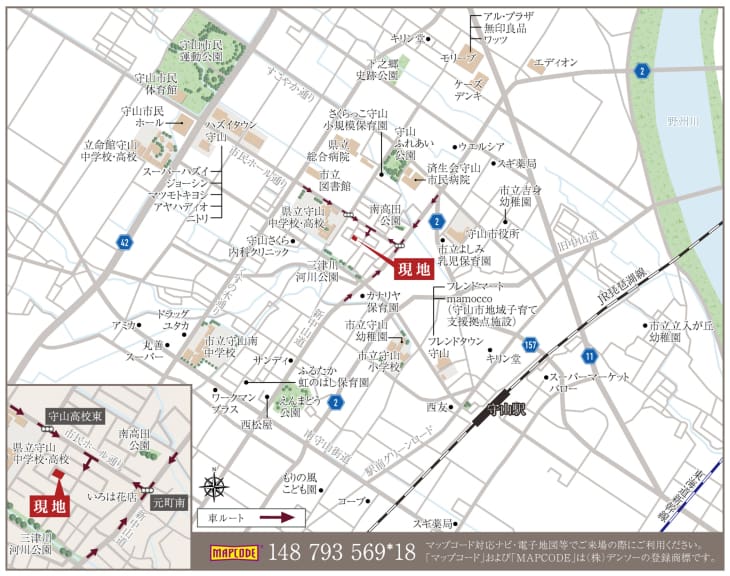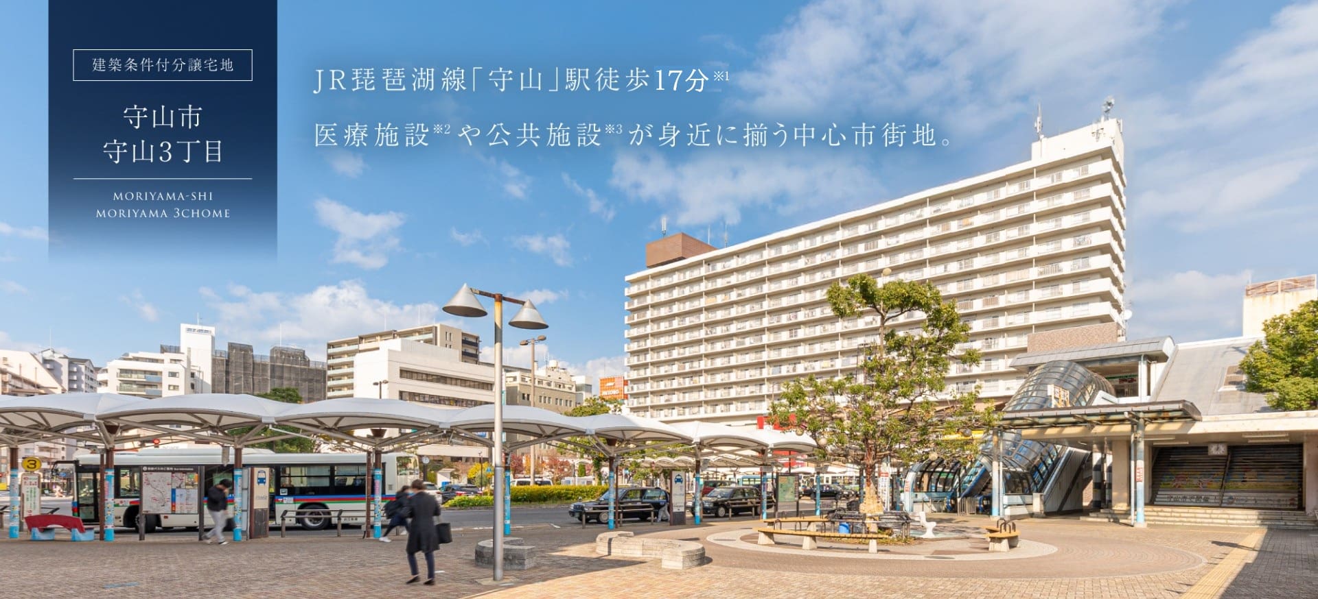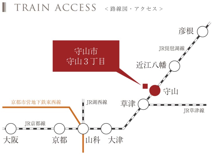 JR琵琶湖線「守山」駅へ徒歩17分。新快速停車駅のため、都心への通勤・通学に便利です。