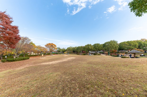 自然豊かな公園で、園内の小川はホタルの鑑賞スポットとして知られています。お子様が楽しめる複合遊具や散歩途中の休憩に便利な東屋も設置されています。
