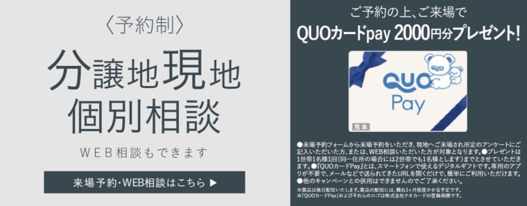 分譲地の雰囲気を現地でご体感ください。WEB予約来場でQUOカードPay2000円分プレゼント中!
