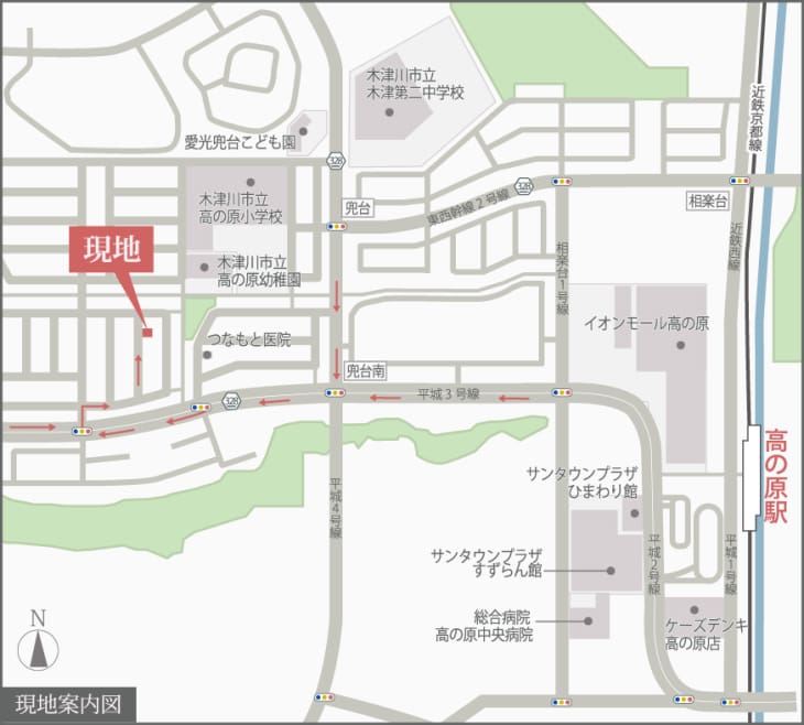 「市立高の原小学校」まで徒歩7分、「市立木津第二中学校」まで徒歩10分、「イオンモール高の原」まで徒歩12分 、子育て世代に生活環境の整った立地です。