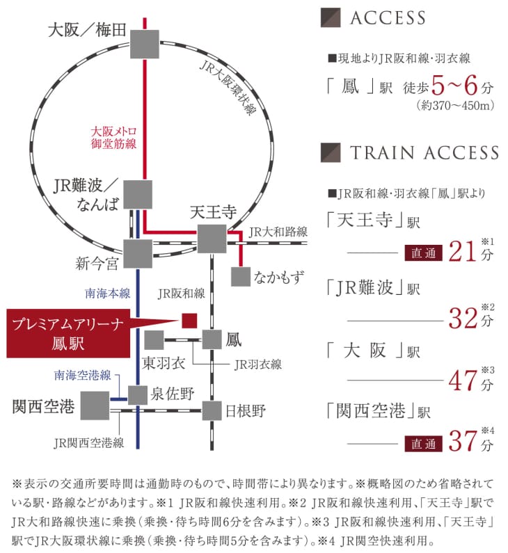 「鳳」駅から「天王寺」駅・「関西空港」駅へダイレクトアクセスが可能。「JR難波」駅、「大阪」駅へも乗換1回でアクセスできます。
