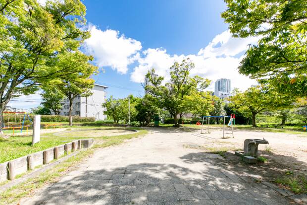 多くの樹木に囲まれた緑豊かな公園。元気よく走り回ることができる広場やブランコ、滑り台、鉄棒などがあり、自然に包まれながらのびのびと遊べます。