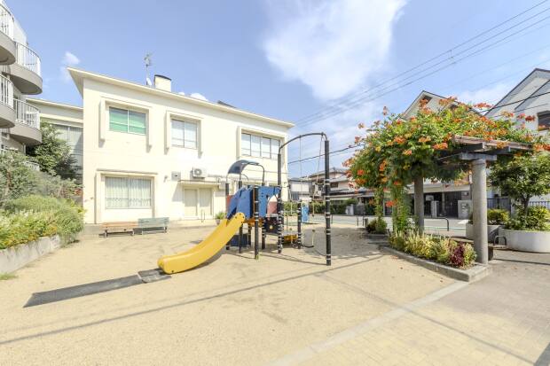 現地からも近く、健康のためのお散歩やお子様との外遊びに気軽に出かけられます。園内には、滑り台付きの複合遊具やベンチなどが設置されています。