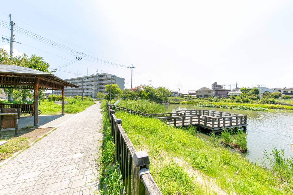 - 小寺池まで徒歩5分(約350~370m)。池の南側には遊歩道があり、水面を眺めながらゆったりと散歩ができます。四季折々の花や植物が楽しめる憩いの場所です。