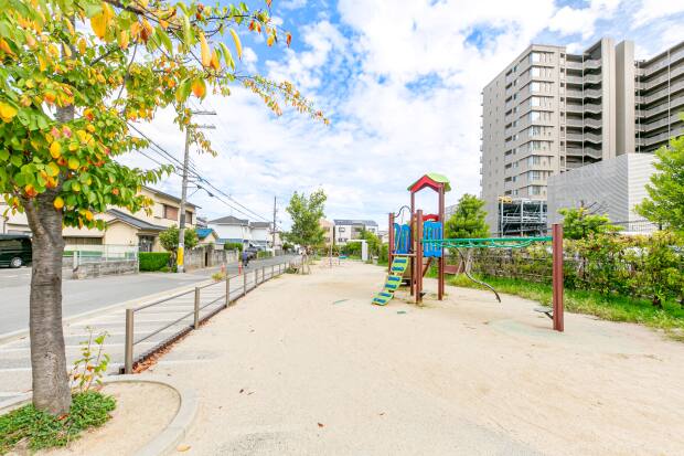 すべり台やネット遊具のある、子どもたちが元気に遊べる公園です。ベンチも設置されているため、大人も休憩しながらゆったり過ごせます。