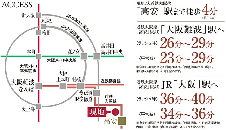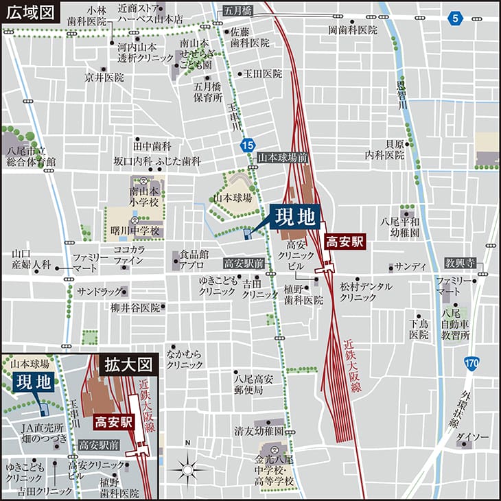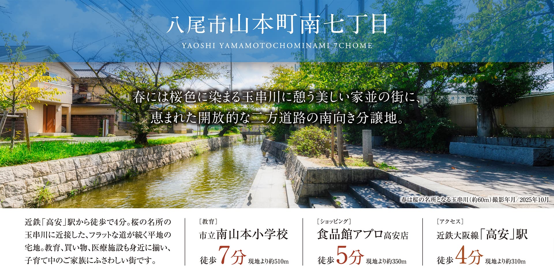 近鉄「高安」駅へ徒歩4分。生活施設も身近に揃い、春には玉串川沿いの桜が彩りを添える緑豊かな街。
