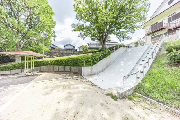 お子様と歩いて行きやすい距離の公園です。幅の広い滑り台があり、親子やお友達同士でも楽しめそうです。屋根付きのベンチで、ゆっくり休憩することもできます。