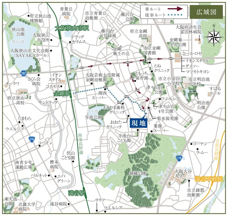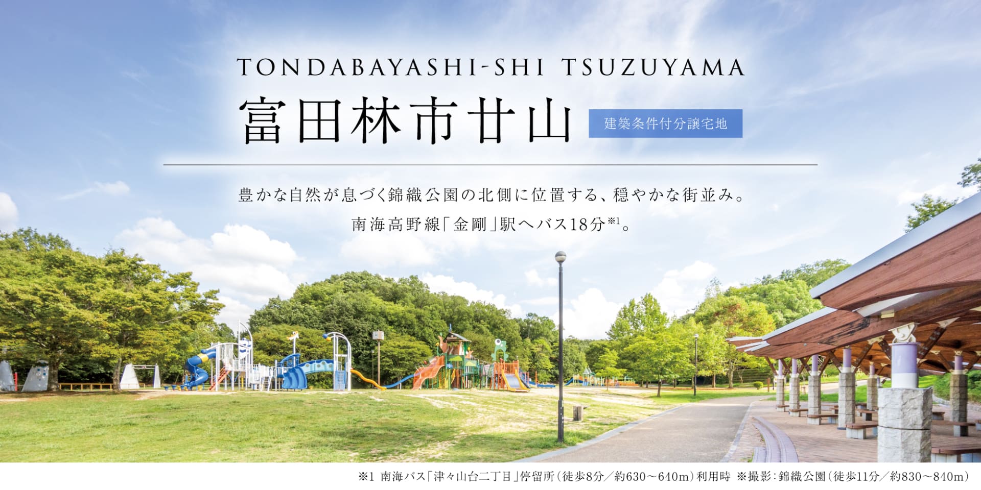 徒歩8分の「津々山台二丁目」停留所から、南海高野線「金剛」駅までバス18分。