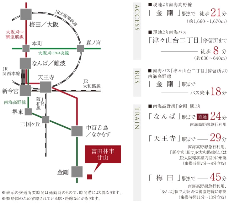 「金剛」駅から「なんば」駅へ直通24分、「天王寺」駅へは29分。