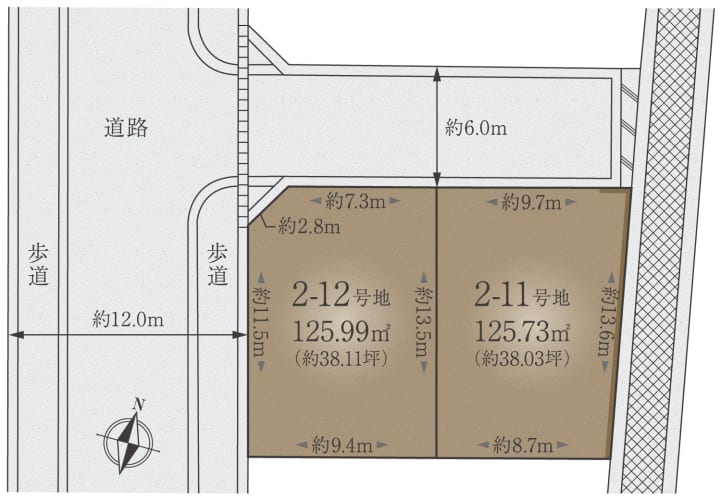 敷地面積38坪超、角地を含む2区画を販売中。前面道路の幅員は6m以上とゆとりがあります。