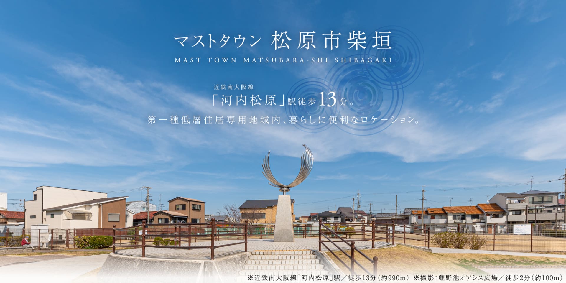 水と緑に彩られる鯉野池オアシス広場へ徒歩2分。落ち着いた住環境が保たれやすい第一種低層住居専用地域に位置する、46坪超の角地。