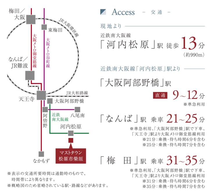 準急が停車する、近鉄南大阪線「河内松原」駅から「大阪阿部野橋」駅へ直通9~12分。