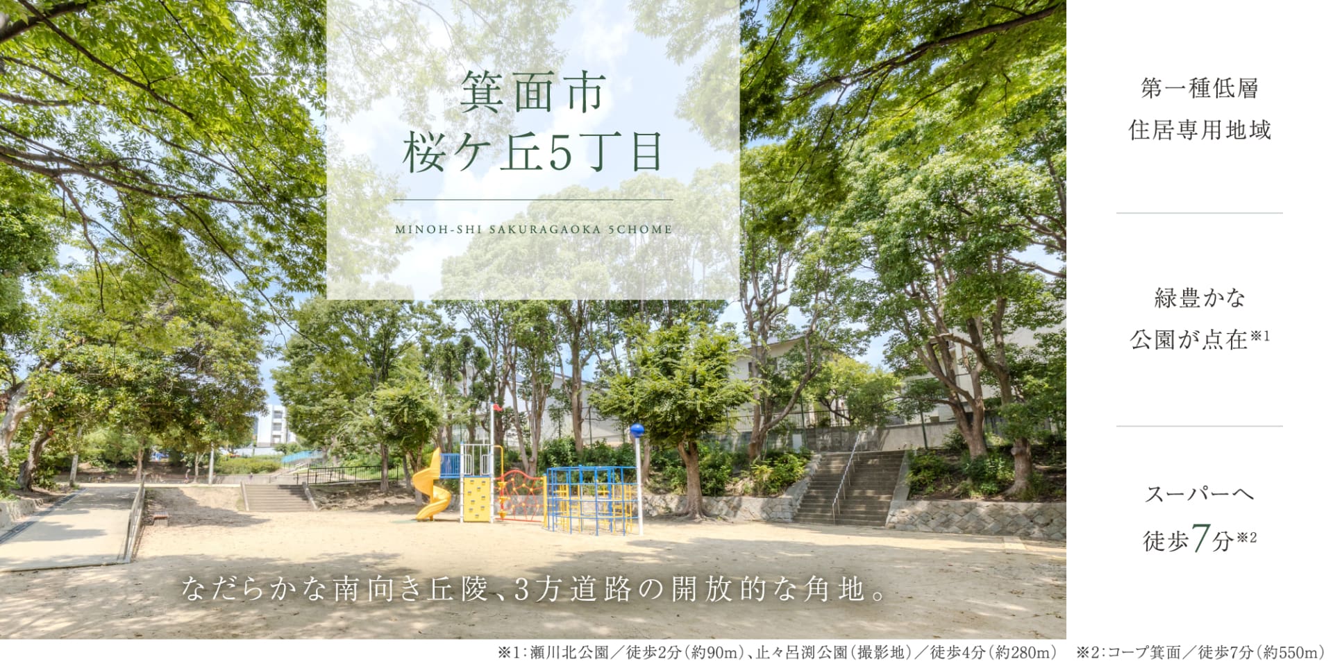 コープ箕面へ徒歩7分、ライフ 箕面桜ケ丘店へは徒歩11分。気分や用途によって2つのスーパーを使い分けられます。