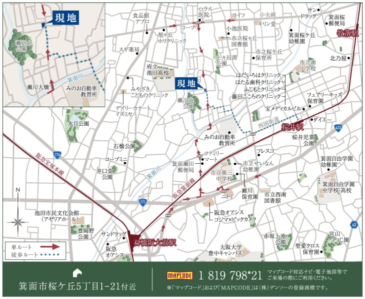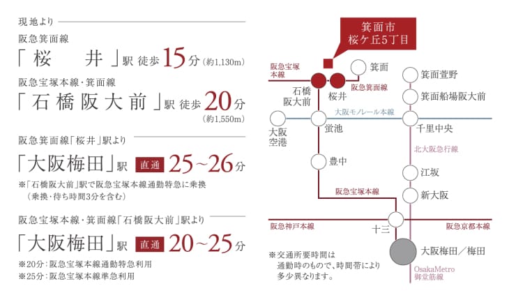 阪急箕面線「桜井」駅へ徒歩15分。「石橋阪大前」駅も徒歩圏内、2線2駅が利用可能です。