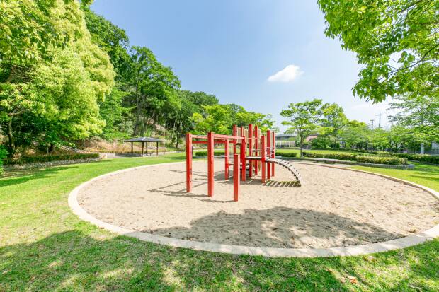 潤沢な緑に包まれる公園。遊具と砂場が設置されています。東屋やベンチもあるため、遊んでいるお子様を座って見守ることができます。