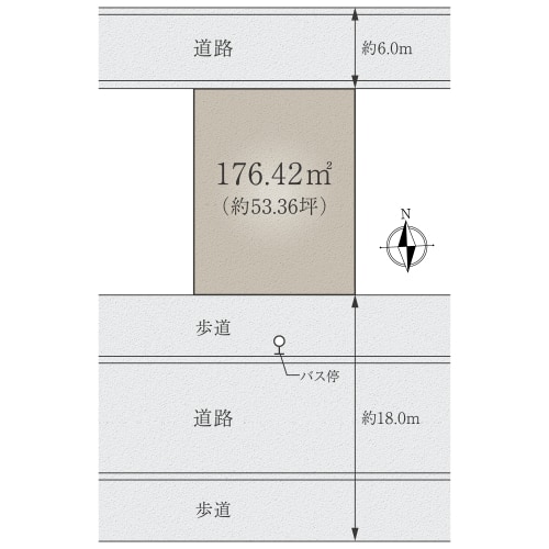 土地面積約53.36坪。北と南が道路に面しており、採光や通風に配慮した住まいづくりが可能です。