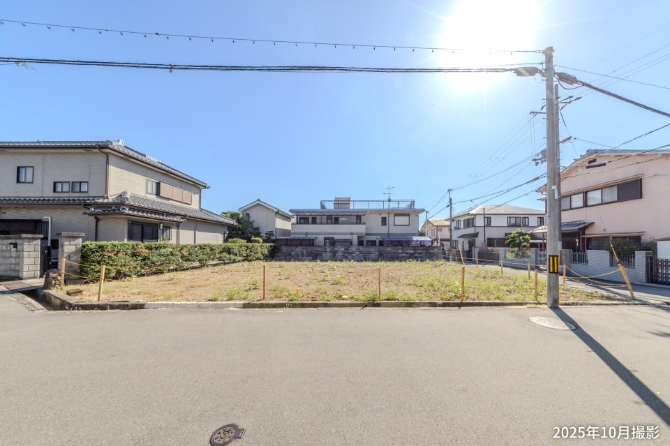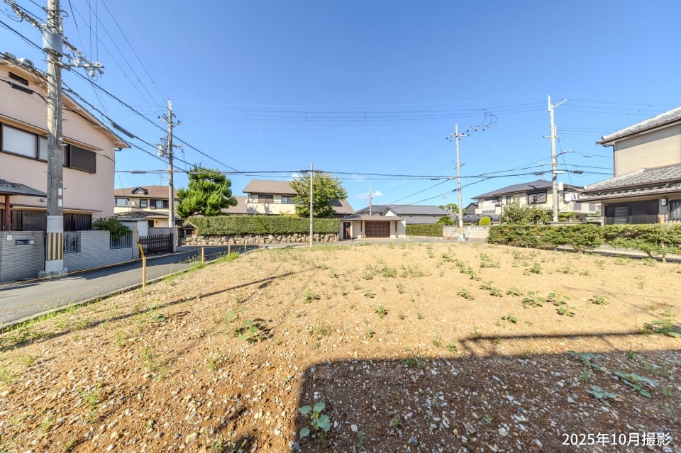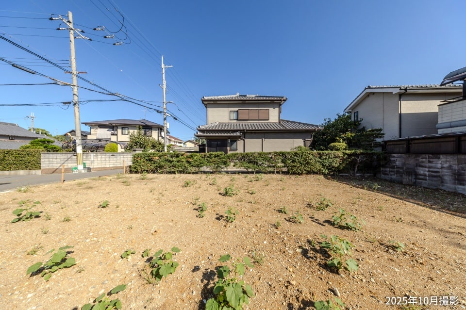 【2号地】駐車スペースを配置しやすい、奥行きのある敷地です。南側にリビングを設けると、プライバシー性の高い住まいづくりが可能です。/2025年10月撮影