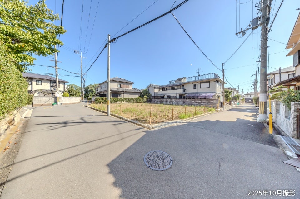 【前面道路】大きな道路に面していないため、大型車の通りが比較的少なく、子育てにも安心です。お客様の想いを形にする「邸別自由設計」で、快適に住まえる理想の一邸をご提案いたします。/2025年10月撮影