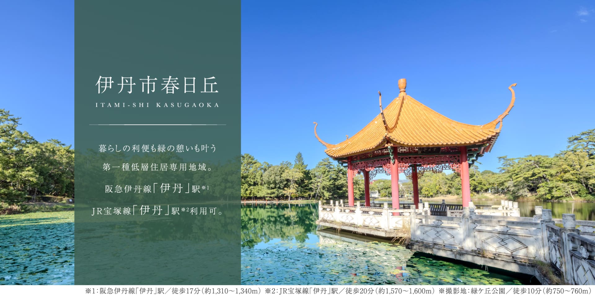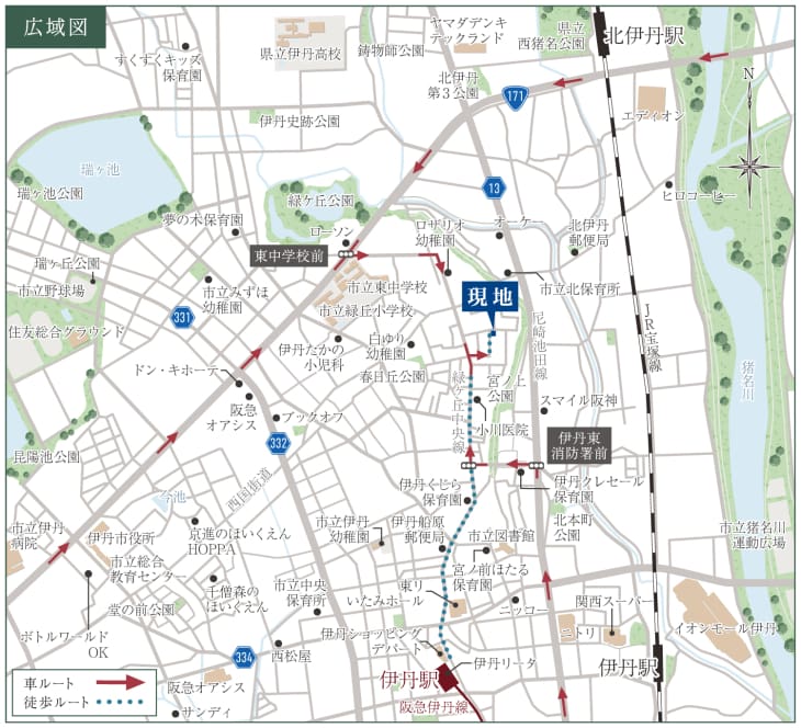 阪急伊丹線「伊丹」駅へ徒歩17分、JR宝塚線「北伊丹」駅へ徒歩18分と、2沿線利用可能。