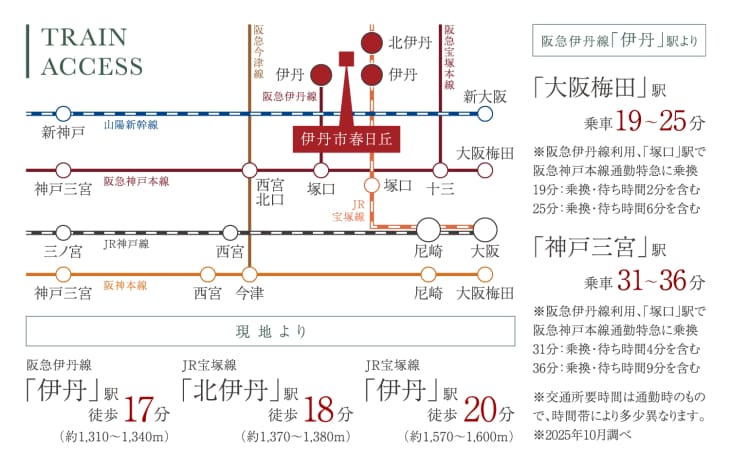 「伊丹」駅から「大阪梅田」駅へは乗車19~25分でアクセスでき、通勤・通学に便利です。
