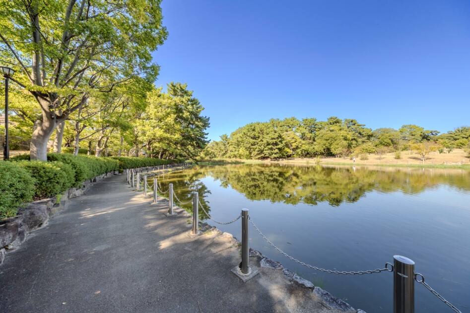 - 緑ケ丘公園まで徒歩10分(約750~760m)。マツやサクラの古木が生い茂る、自然豊かな公園。広い敷地には、体育館やプール、遊具広場などがあり、のびのびと過ごすことができます。池の周りを散策やウォーキングを楽しむこともでき、リフレッシュや健康づくりにもおすすめのスポットです。