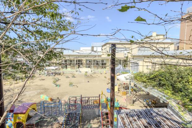 住宅街にある緑豊かな公園。滑り台やブランコ、鉄棒などの遊具が揃います。かけっこや鬼ごっこをして走り回れるスペースもあり、元気にのびのびと遊ぶことができます。