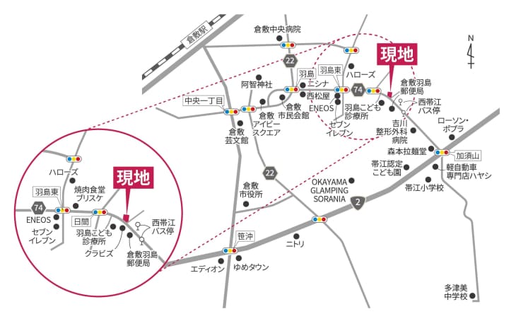 国道2号線まで車で3分(約920m)、JR倉敷駅まで車で11分(約3,400m)。