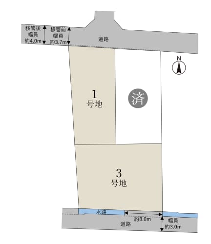 北側道路の最小幅員は現状では約3.7mですが、松山市へ移管後は約4.0mとなります。