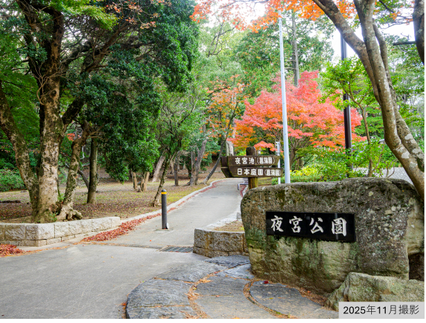 春は桜、初夏は花菖蒲につつじ、冬は梅が美しく咲き、四季折々に楽しませてくれる公園です。特に花菖蒲は7,000株が夜宮池などに植えられていて、日本有数の規模を誇っています。2025年11月撮影