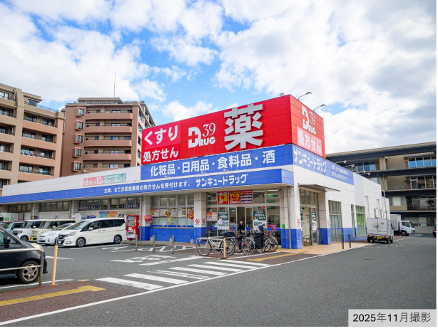 営業時間はドラッグコーナーが8:30~22:00、調剤が8:30~18:00(土曜日は8:30~13:00)です。2025年11月撮影