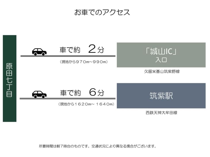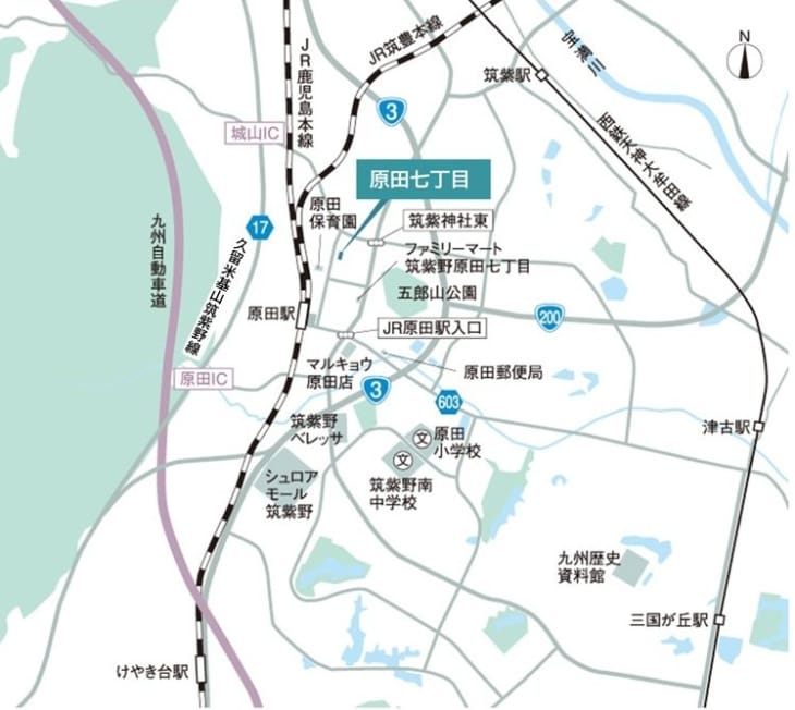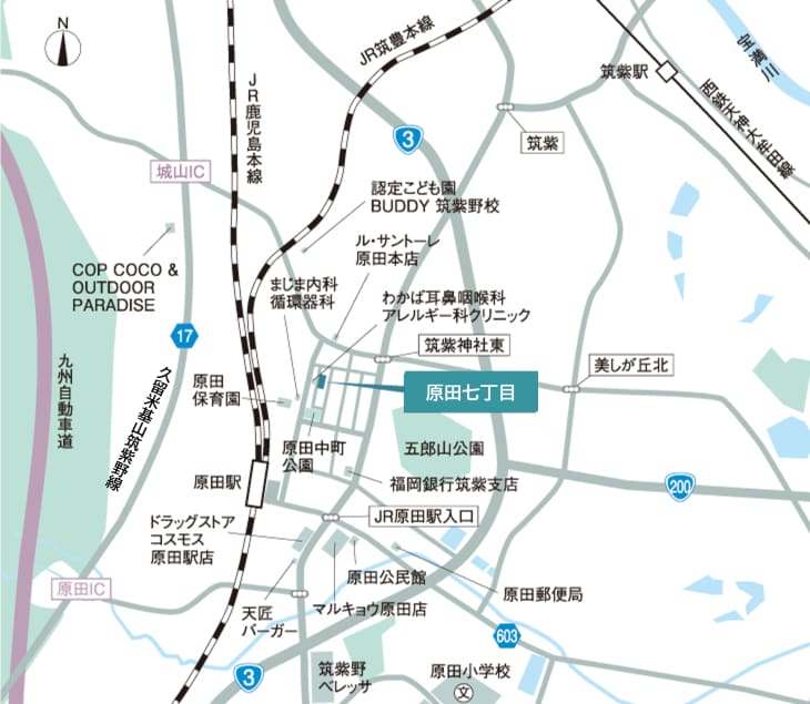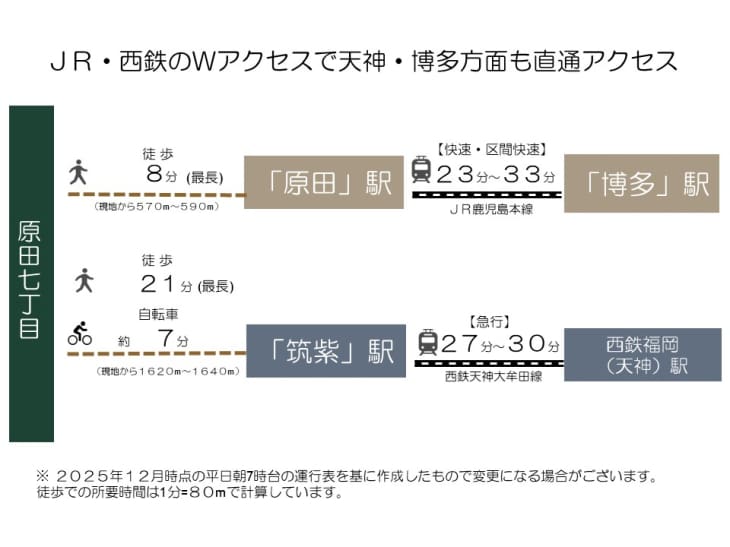 ![]() JR「原田」駅と西鉄「筑紫」駅の2路線利用可能 JR「原田」駅と西鉄「筑紫」駅利用で、博多・天神方面へのアクセスもスムーズです。JR「原田」駅:徒歩8分(最長)/570m~590m、西鉄[筑紫」駅:徒歩21分(最長)/1620m~1640m |