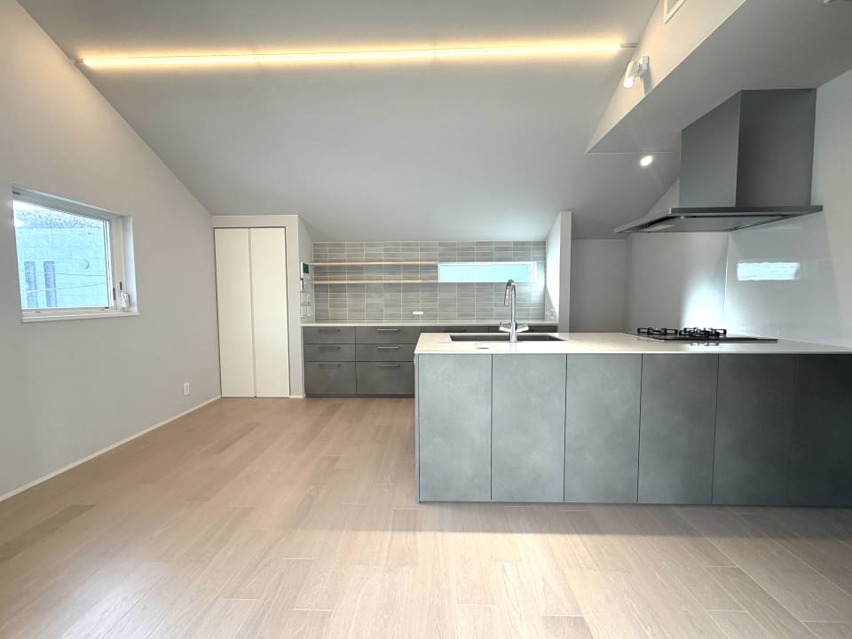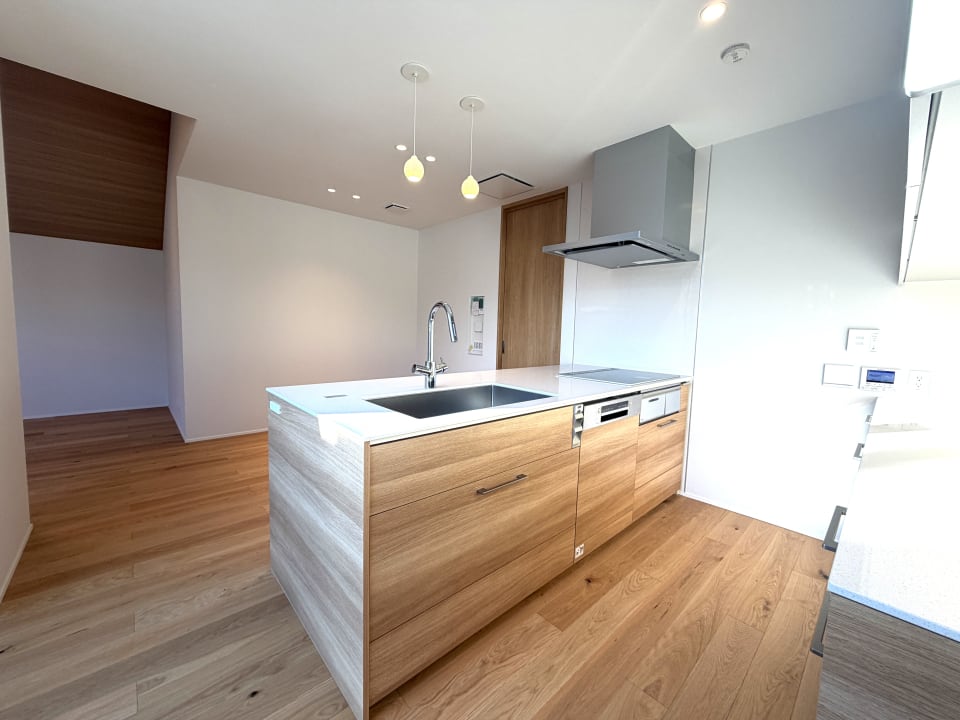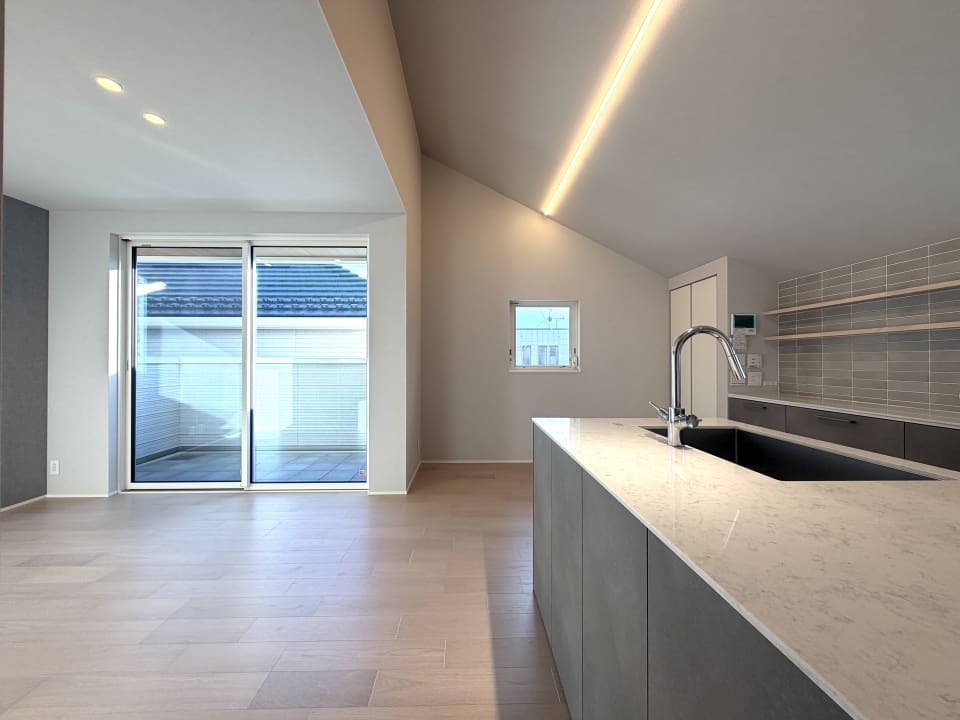空間に開放感を生み出す、フルフラットの対面キッチン。ダイニングテーブルを横付けすると食事の配膳・片付けがしやすく、お子様もお手伝いしやすいです。/2026年1月撮影