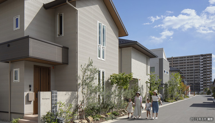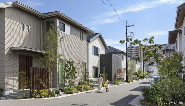 広島市中心部から5km圏内、JR下祇園の駅前に位置する『コモンステージ祇園』。広島市内では希少なまとまった平地に開発された、戸建住宅、賃貸住宅「シャーメゾン」、医院等が共存する複合的分譲地です。地名の由来である京都祇園と、古くから縁豊かな立地にちなみ、「趣のある自然を上手に取り入れる都の暮らし」をヒントに、広島らしさと現代的センスを大切にしたまちを描きました。