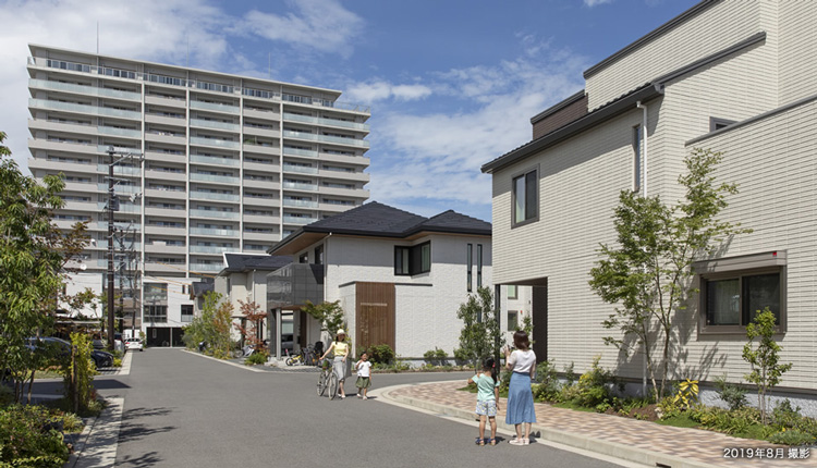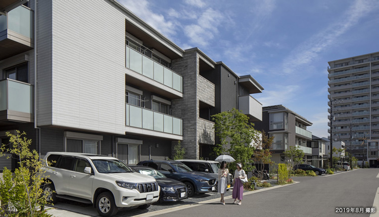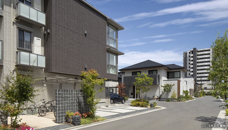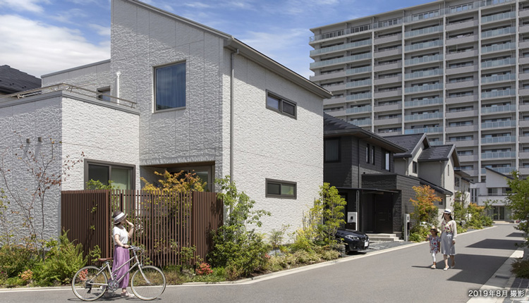 開発区域内のマンションは、戸建住宅と共通のコンセプトで計画されたもの。都市的なセンスを大事にしたデザインが、まちの風景になじんでいます。