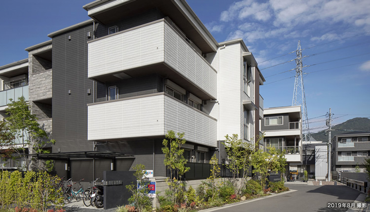 端正な表情でまちかどに建つ賃貸集合住宅は、まちのランドマーク的な存在に。建物を引き立てる道路沿いの豊かな緑は、まちなみをも美しく彩ります。
