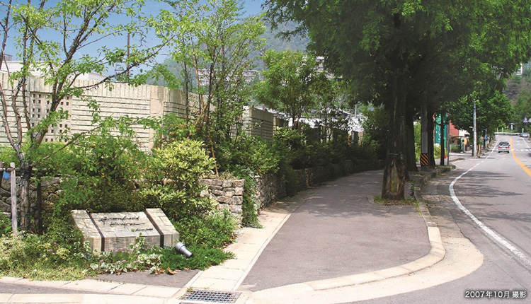 先行外構で緑地帯を設け、まちの顔づくりをおこなう