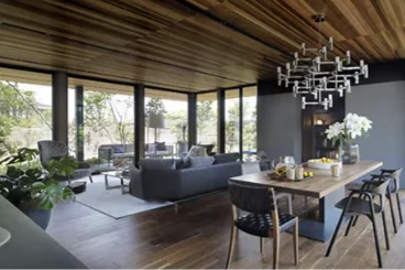 木造住宅であっても同じようにダイナミック空間が可能なのも積水ハウスならでは。木造では「シャーウッド構法」を採用。これは、日本の伝統的な木造建築に使われている木造軸組構造をベースに、強い耐力壁で地震などの力などによる変形を抑える「モノコック構造」と開口部を大きくとれる「ラーメン構造」の長所を融合。必要に応じて開口部の大きさを変えることが可能になりました。