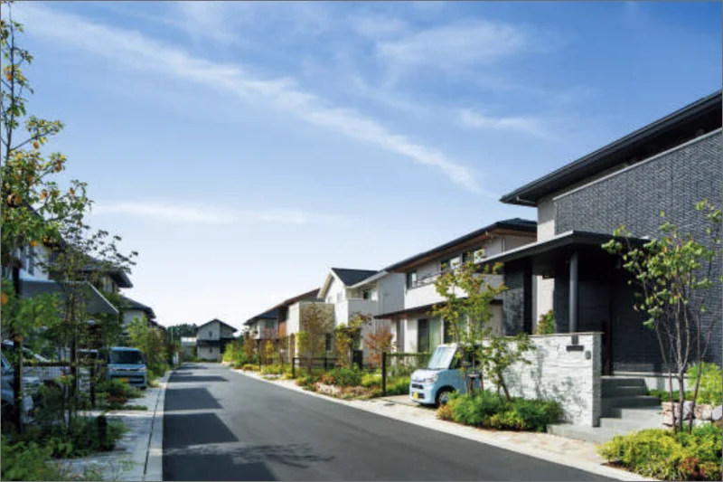 積水ハウスの分譲地は、緑視率の高さが特徴です。それは年月とともに緑と家並みが美しく成熟する「経年美化」の思想でデザインしているため。地域に合った庭木を植える「5本の樹」計画、まちなみガイドラインなど、愛着と資産価値を育む工夫を盛り込んでいます。