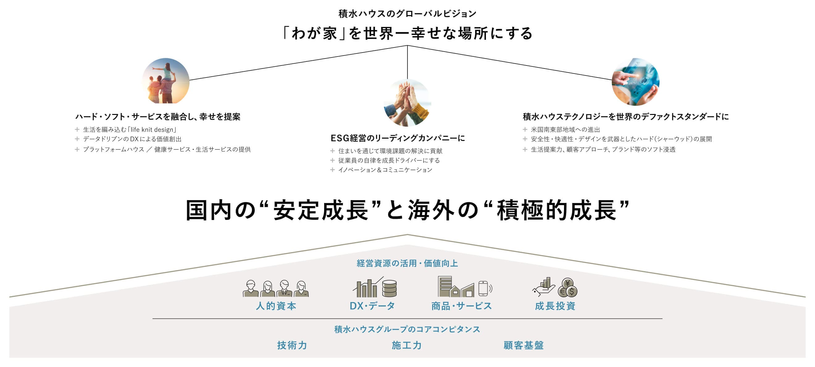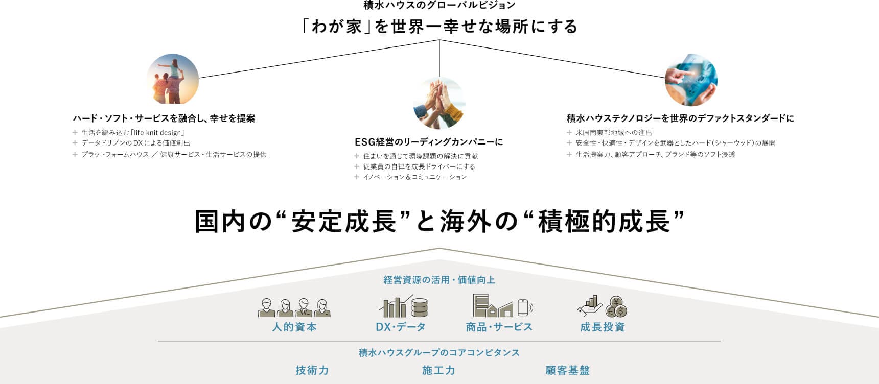 グローバルビジョン“「わが家」を世界一幸せな場所にする”の実現に向け、住を基軸に、創業以来培ってきたコアコンピタンスをもとに、融合したハード・ソフト・サービスを提供するグローバル企業への成長を目指しています。