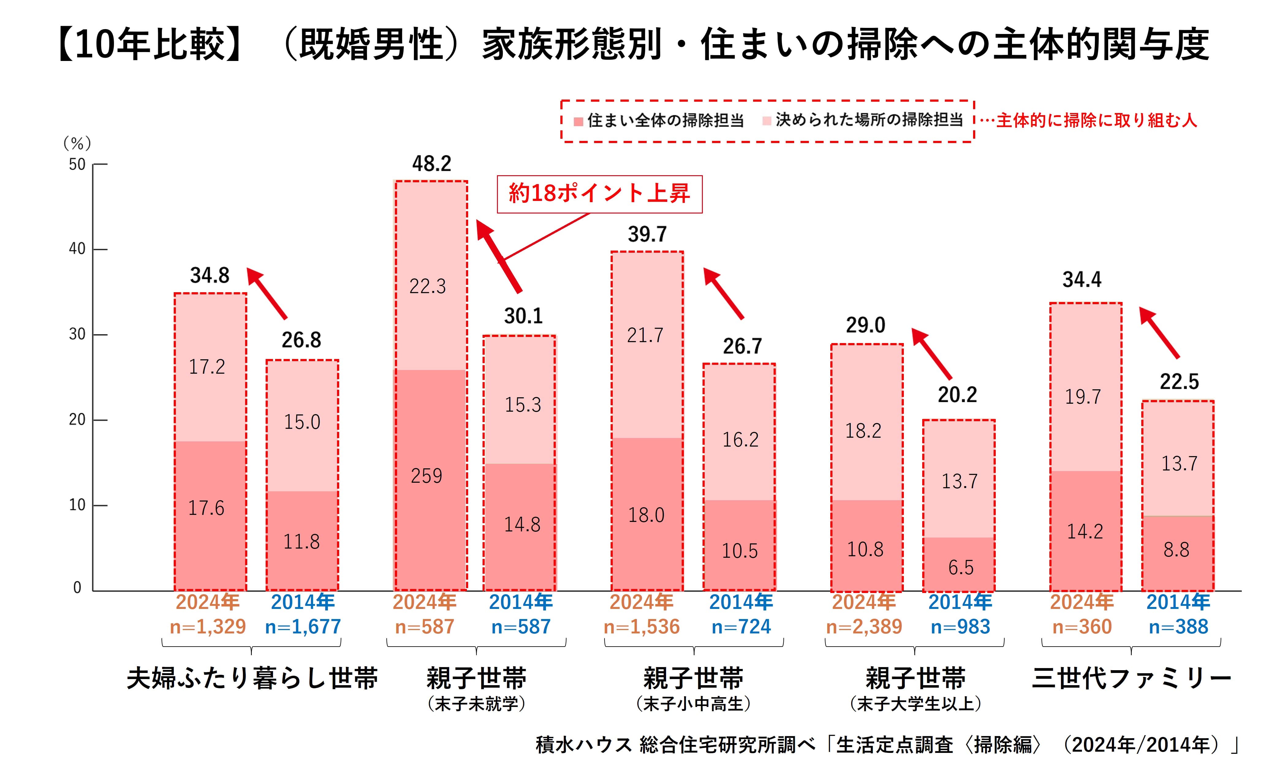 既婚男性は夫婦、親子、三世代ファミリーのすべての家族形態で、「住まい全体の掃除担当」「決められた場所の掃除担当」が前回より増加しており、中でも、末子が未就学の子どもが幼い家族の男性は約18ポイント上昇しました。