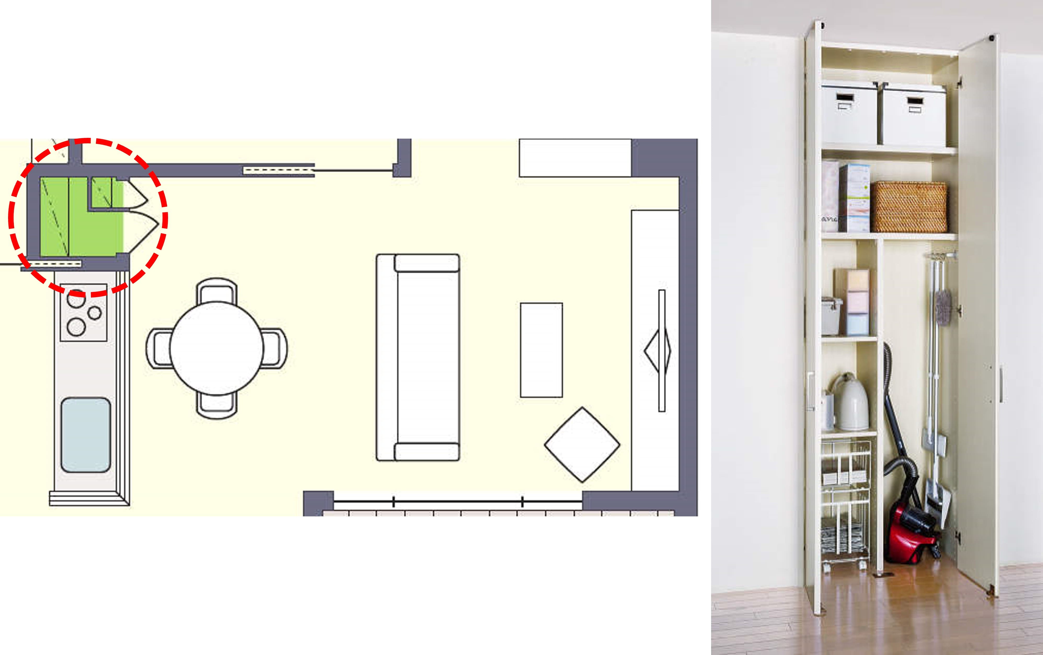 1)リビングで使う掃除道具を分けて収納できるリビングクローク「お掃除リビクロ」