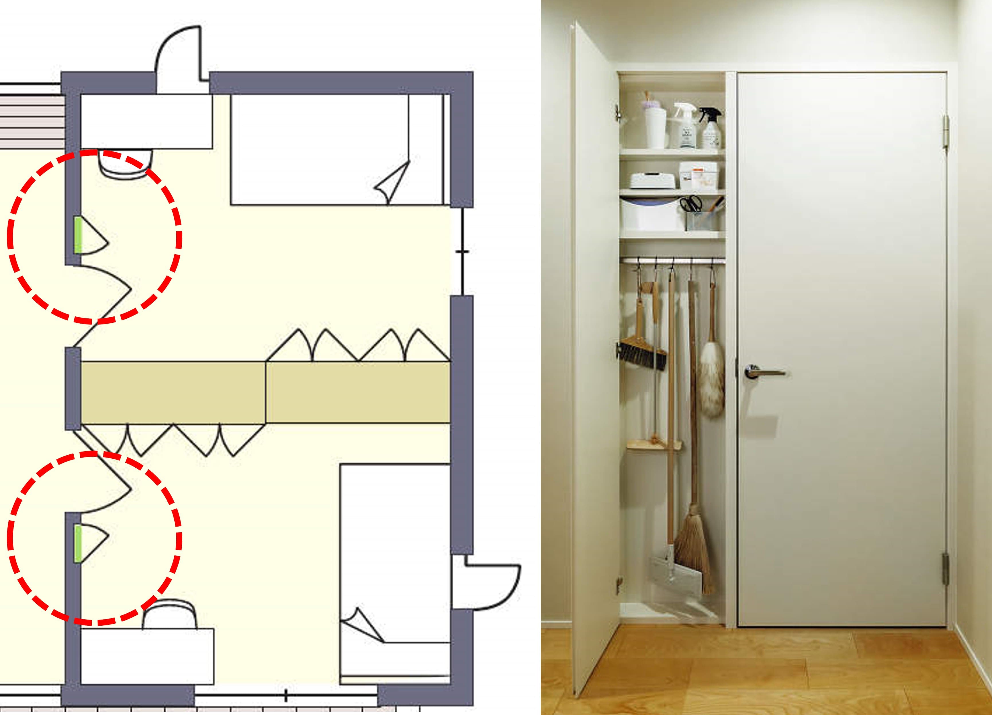 汚れを見つけたときにサッと掃除用具を取り出して掃除できるのが理想です。壁厚を利用して、各部屋に省スペースの掃除道具入れを設けていかがでしょうか。子どもでも、自分で掃除をしやすくなります。