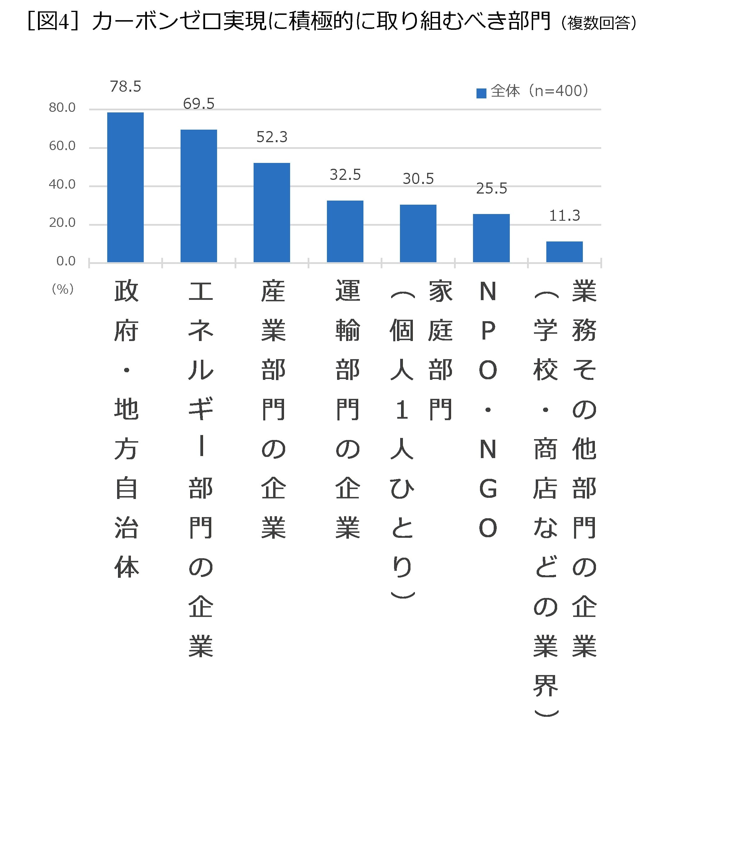 しかし、その一方で、カーボンゼロの実現には「個人が積極的に取り組むべき」と答えた方は3割と、“脱炭素化”を「自分ごと」ととらえて取り組むことが必要だと感じている人は、まだまだ少ないことがわかりました。